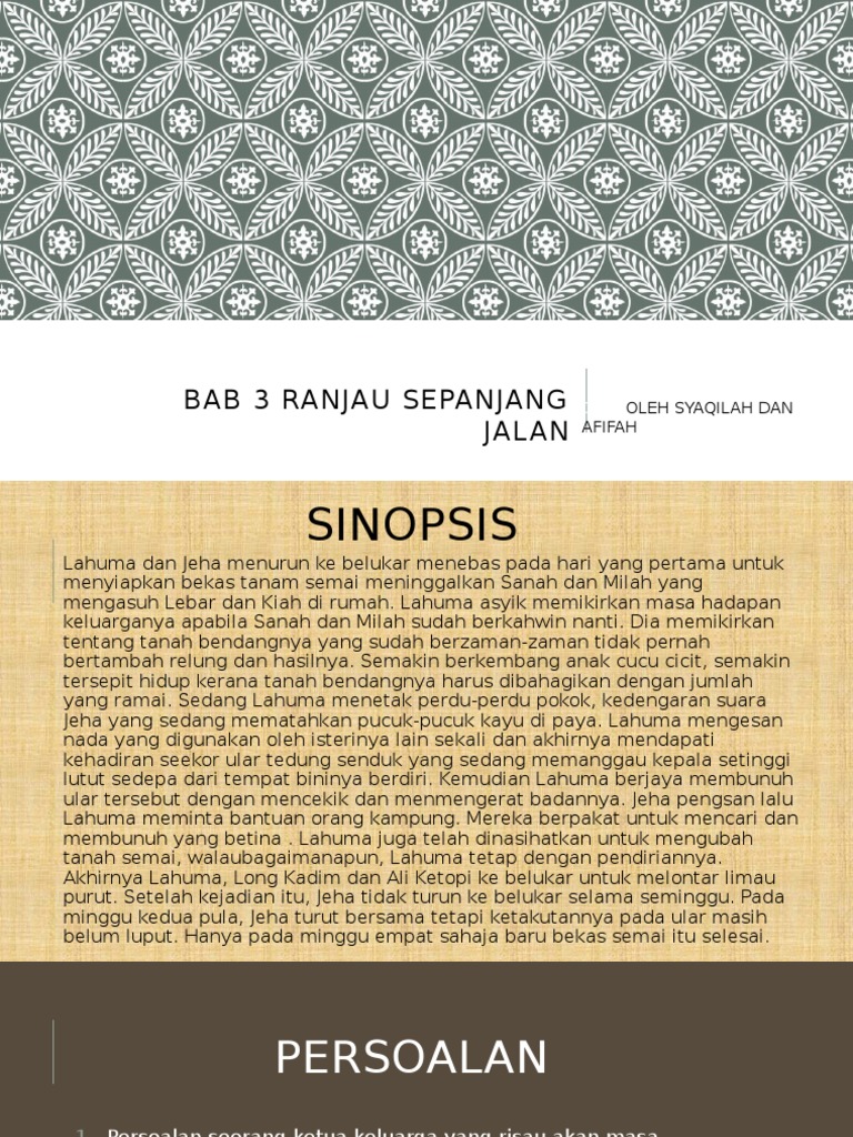 Ranjau Sepanjang Jalan By Shahnon Ahmad. Analisis Teks Moden Ranjau Sepanjang Jalan 10 Pengenalan Seperti yang telah diketahui kesusasteraan Melayu itu sendiri terbahagi kepada dua iaitu kesusasteraan Melayu tradisional dan kesusasteraan Melayu moden. Malah telah menjadi pegangan yang kukuh sejak zaman datuknya Haji Debasa.
