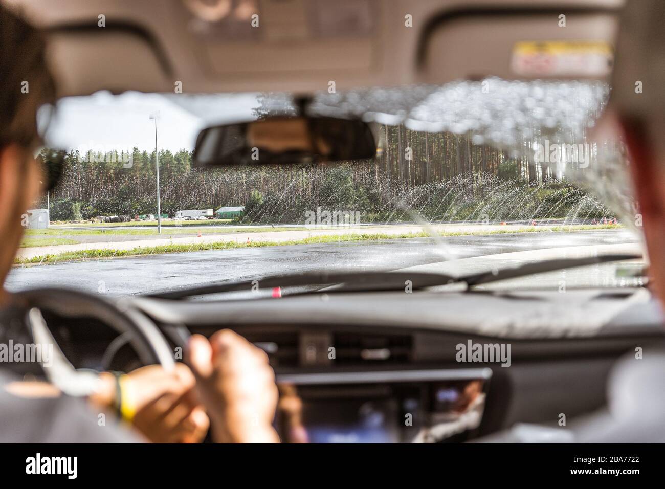 Safe Driving School In Wet Conditions Driving Instructor Man Behind The Wheel Learning How To Drive Stock Photo Alamy